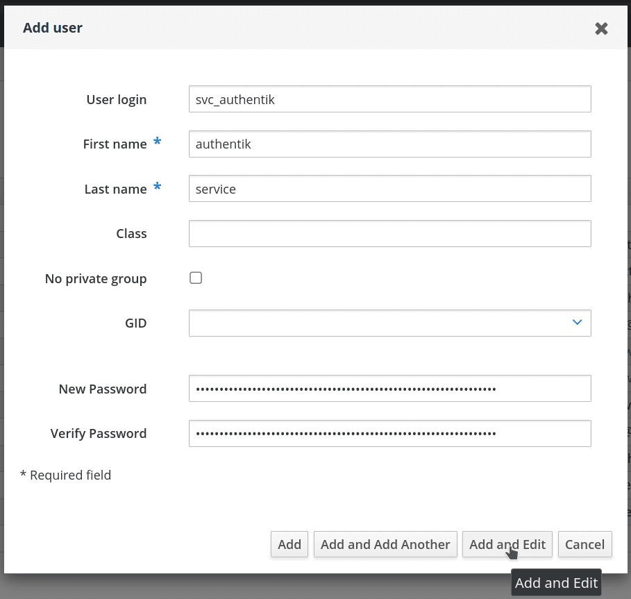 2. Create a user in FreeIPA, matching your naming scheme. Provide a strong password, example generation methods: pwgen 64 1 or openssl rand 36 | base64 -w 0. After you are done click Add and Edit.